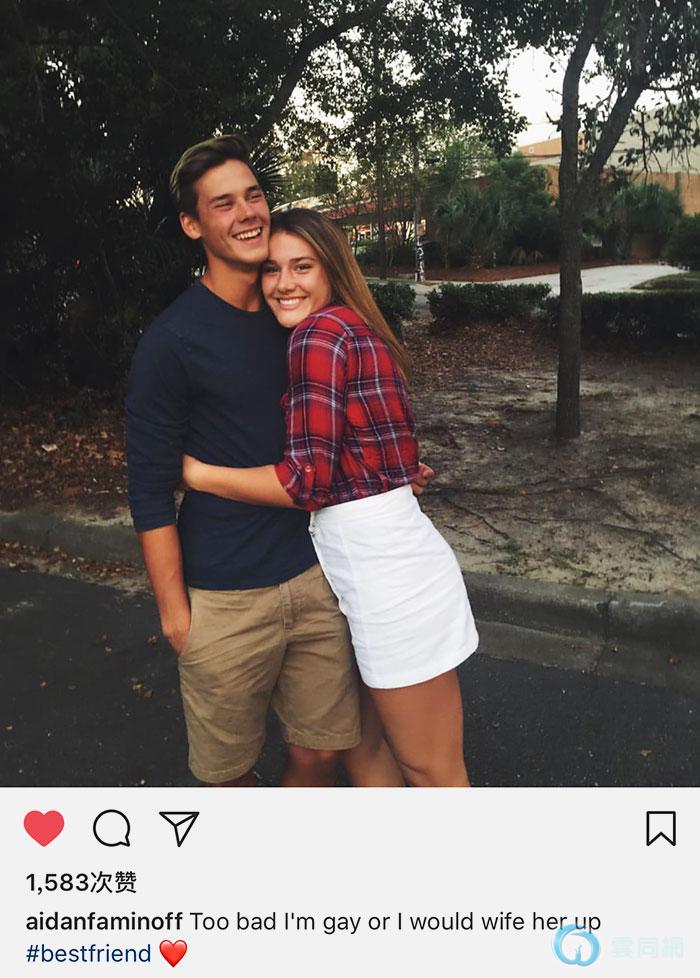 “好可惜我是Gay,不然就娶她为妻了。”留言末尾,Aidan加了一个话题标签:#最好的朋友。