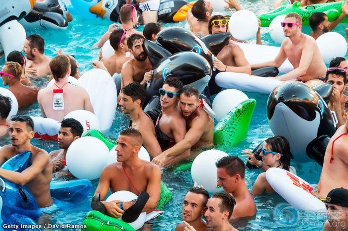 当地时间11日,8000多名同性恋游客涌入西班牙巴塞罗那的梦幻岛水上乐园(Isla Fantasia Water Park),参加盛大的水上狂欢派对。