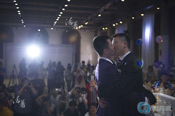 5月17日,长沙,“中国同性婚姻登记第一案”的原告孙文麟、胡明亮的婚礼如期举行。在聚光灯和众人的掌声中,他们交换了戒指,相拥亲吻。