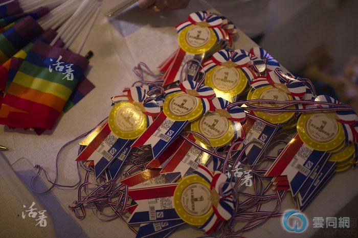 与传统婚礼收礼金不一样,他们的婚礼只收写着祝福话语的纸条,在签到台签到之后,可以领取印有孙文麟和胡明亮名字的巧克力棒和一面彩虹旗。