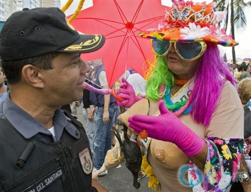 恋大游行,图为一位易装癖者在同警察调侃。