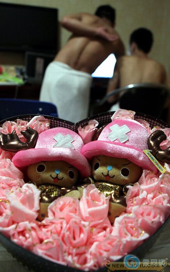 柘荣县城的一家小宾馆,是他们的新婚洞房,布置得简洁而温馨。陆忠是柘荣人,家里的房子正在建造,刘旺强家在福安的一个小村庄,老房几年前被一场大火烧为灰烬。图为一位东北的网友为他们寄来的爱情玩偶。
