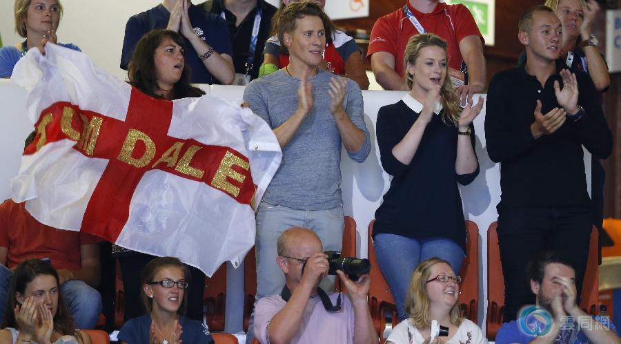 2014年8月3日 爱丁堡——汤姆·戴利成功卫冕英联邦运动会男子十米跳台冠军 8月2日,英格兰选手汤姆·戴利的母亲黛比(左一)、第81届奥斯卡最佳原创剧本奖得主达斯汀·兰斯·布莱克(左二)、好友索菲·李(右一)与约瑟夫·坎茨在看台上为其祝贺。当日,在爱丁堡举行的第20届英联邦运动会跳水男子十米跳台决赛中,该项目2009年世锦赛冠军、2012年伦敦奥运会铜牌得主、卫冕冠军、英格兰选手汤姆·戴利以516.55分的总成绩,获得冠军。
