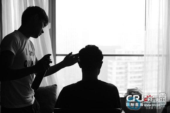 2. Scott一边跟Brian聊着天,造型师一边帮他打理发型,Scott的脸上始终洋溢着幸福的笑容。