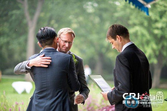 18 英国大使吴思田举起香槟恭祝Brian。在至亲好友的见证下,Scott和Brian拿到了带有钢印的结婚证,Brian在微博中说“Love is GREAT”。让我们相信,爱是可以没有界限的,他们举起杯中的香槟为此庆祝,至爱无上!