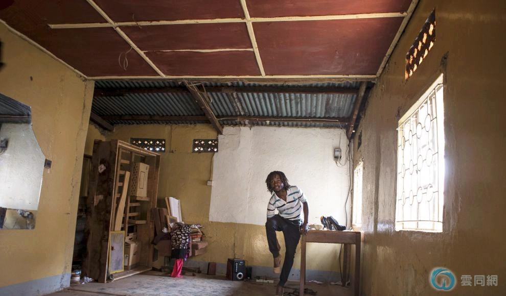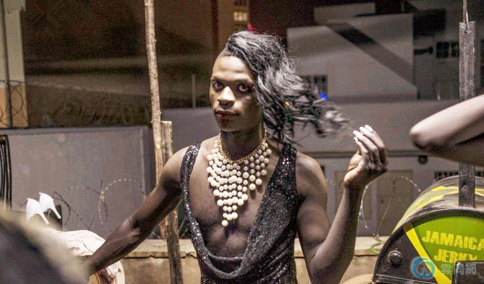 乌干达坎帕拉,在当地一家秘密餐馆里举行的先生小姐骄傲选美比赛开幕式,一名表演者站在舞台上准备表演。