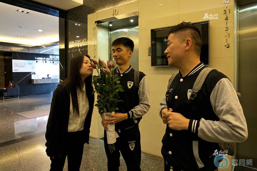 在公司,并非所有的员工都知道安徽与叶剑斌的关系。“我们不会避讳也不刻意去说,但公司里也有一些员工是同志,所以他们也知道。”图为两人经常买花去公司布置,在楼下碰见了公司的女员工,她凑上去闻了闻花香。