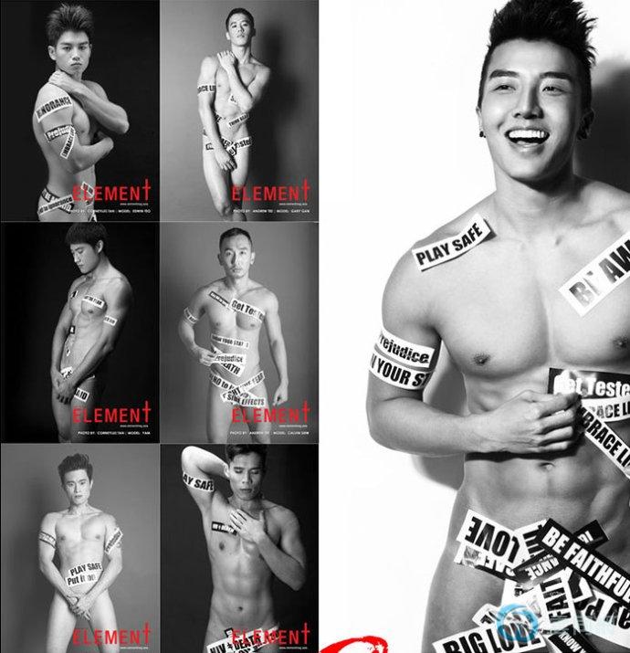 为了配合世界艾滋病日,“我脱了,你戴上!”为主题,亚洲知名男同志杂志《ELEMENT 爱力先生》推出防艾公益视觉大片,9名运动型男模与艺人全裸上镜,提醒大家加强安全性行为意识。