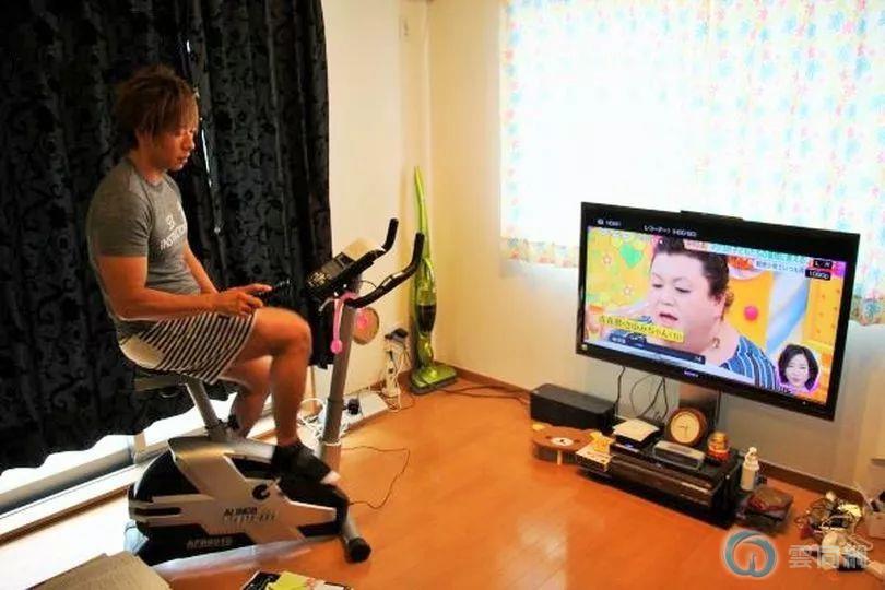 清水健一边健身,一边看电视。