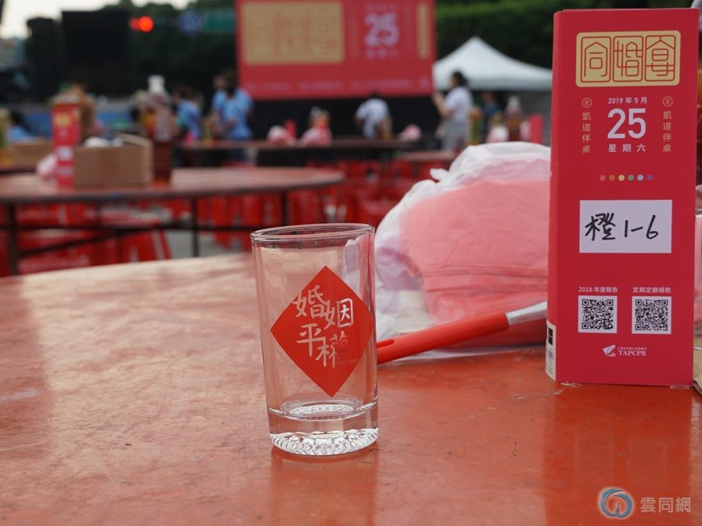2019年当地时间5月25日,台湾首场具法律意义的同性婚姻晚宴在台湾总统府前的凯达格兰大道上举办,席开160桌,有近2,000人参与,主办单位台湾伴侣权益推动联盟(伴侣盟)特别订做印有“婚姻平权”字样的水杯。