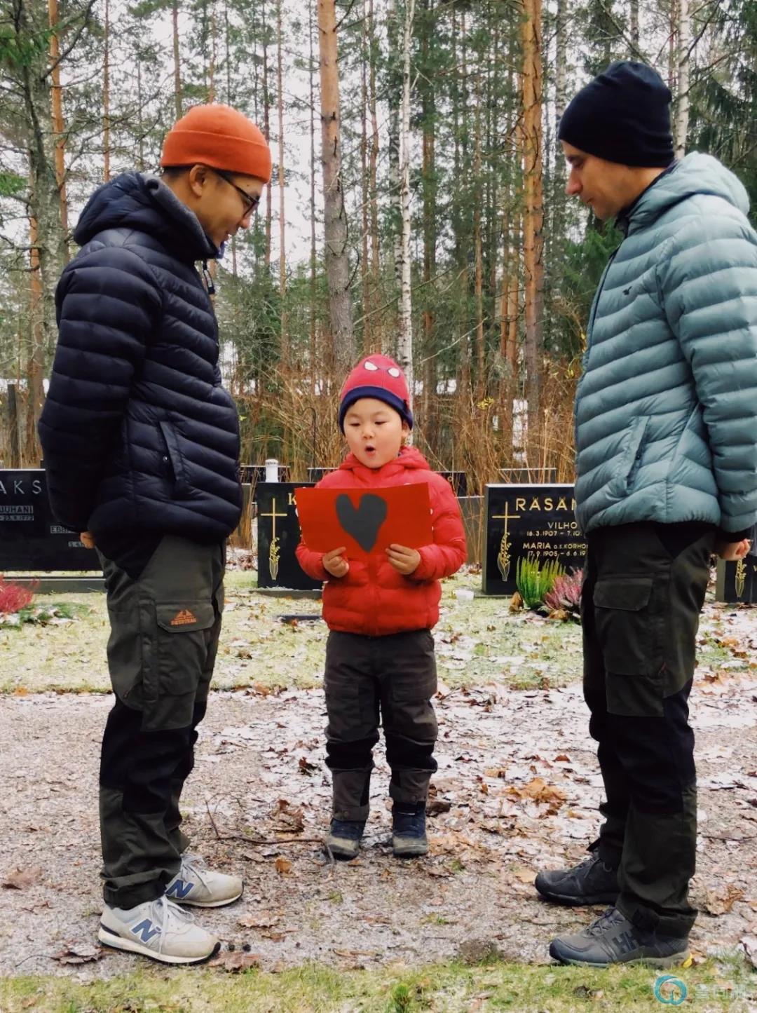 我们的婚礼仪式在Timo父母的墓前。我们把手机放在了墓碑上,没有排练,也没有让安安练习。当时,安安手里拿着小纸条,特别正经的样子,一个字一个字地说,「- Iskä(芬兰语的父亲),你愿意和我超好的爸爸结婚吗?- 爸爸,你愿意和我有趣的Iskä结婚吗?」