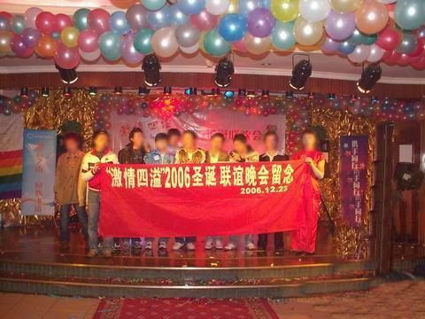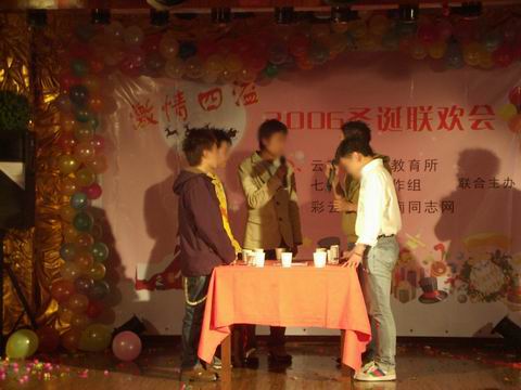2006年12月23日晚,来自云南各地的300余名朋友聚集在昆明某酒店的大宴会厅里,共同迎接圣诞的到来。这次晚会是由云南省健康教育所七彩天空工作组和彩云天空云南同志网共同举办的。多年以来两家合作举行过多次大型活动,得到同志朋友们的广泛支持和热烈响应。23日的圣诞晚会更成为辞旧迎新,献给2006年的最后一道靓丽风景线。