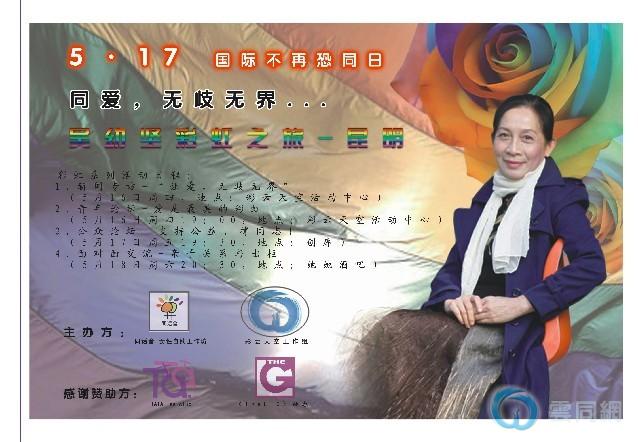 517日——国际不在恐同日,今年云南省彩云天空工作联合同话舍在517日,邀请到国内首位公开身份的同志母亲——吴幼坚到昆明开展5.17国际不再恐同日“同爱,无歧无界”系列活动,欢迎参加。