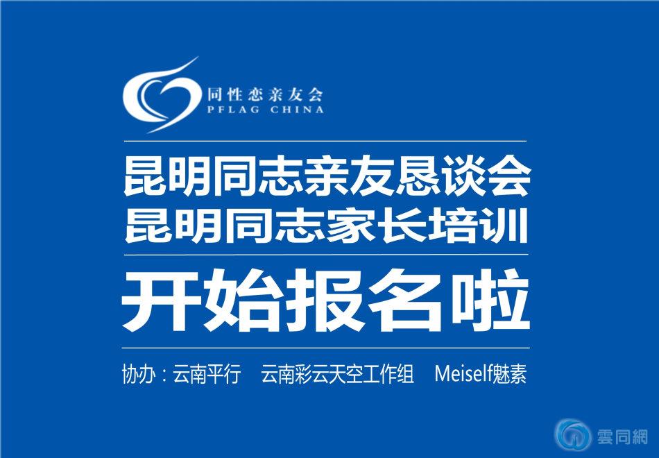 您好!2014年4月12日(周六)同性恋亲友会将联合云南平行、云南彩云天空工作组、Meiself魅素在云南省昆明市召开昆明同志亲友恳谈会。会议目的是组织同志父母、亲人面对面交流,消除孤独感;分享接受亲人出柜的感受、处理经验,倡导心灵沟通,理解包容;倾听同性恋伴侣生活的自述,增强父母、亲人对同志未来的信心。