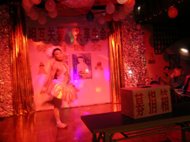 12月30日,昆明市健康教育所、昆明春雨同心工作组在春雨芳草园活动中心举行了一次"相互关爱、共享生命"的主题晚会,为一名艾滋病患者(男同)募捐治疗费。