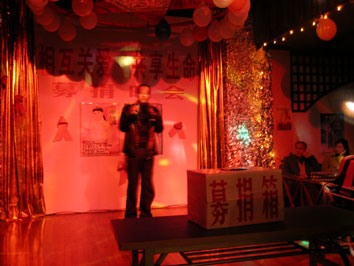 一首精彩的歌曲之后,晚会在昆明春雨同心工作组的成员精心编排的手语歌曲"感恩的心"中拉开序幕,伴着歌声我们回想起那些在死亡线上与病魔斗争的勇敢者,募捐活动由昆明市健康教育所所长杨佩军主持,是云南省性病/艾滋病协会王汝巽会长、昆明市防艾办胡为民主任也在晚会上发了言。他们强调:今天我们有这么多的组织和其他个人来关注感染者的事,我们很高兴,你们真正的是本着"以人为本"的思想在做事,我们只有认真的贯彻"遏止艾滋、履行承诺"才能打赢这场没有硝烟的战争,我们希望大家的共同努力一定会创造出一个美好的明天。