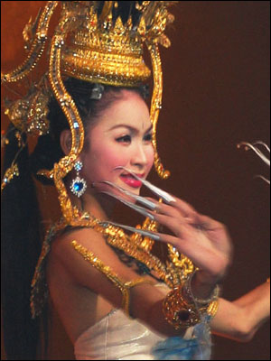 The song used frequently for dancing and singing by transgender entertainers, originating from popular Chinese TV series "Journey to the West--A Monk in Tan Dynasty on his trip to India to study Buddism ", one of the 4 ancient traditional calssical novels in China. The lady in this TV clip is the Queen of the All-female Kingdom, who is desperate trying to persuade the monk to stay with her and enjoy her high position and great wealth ...............