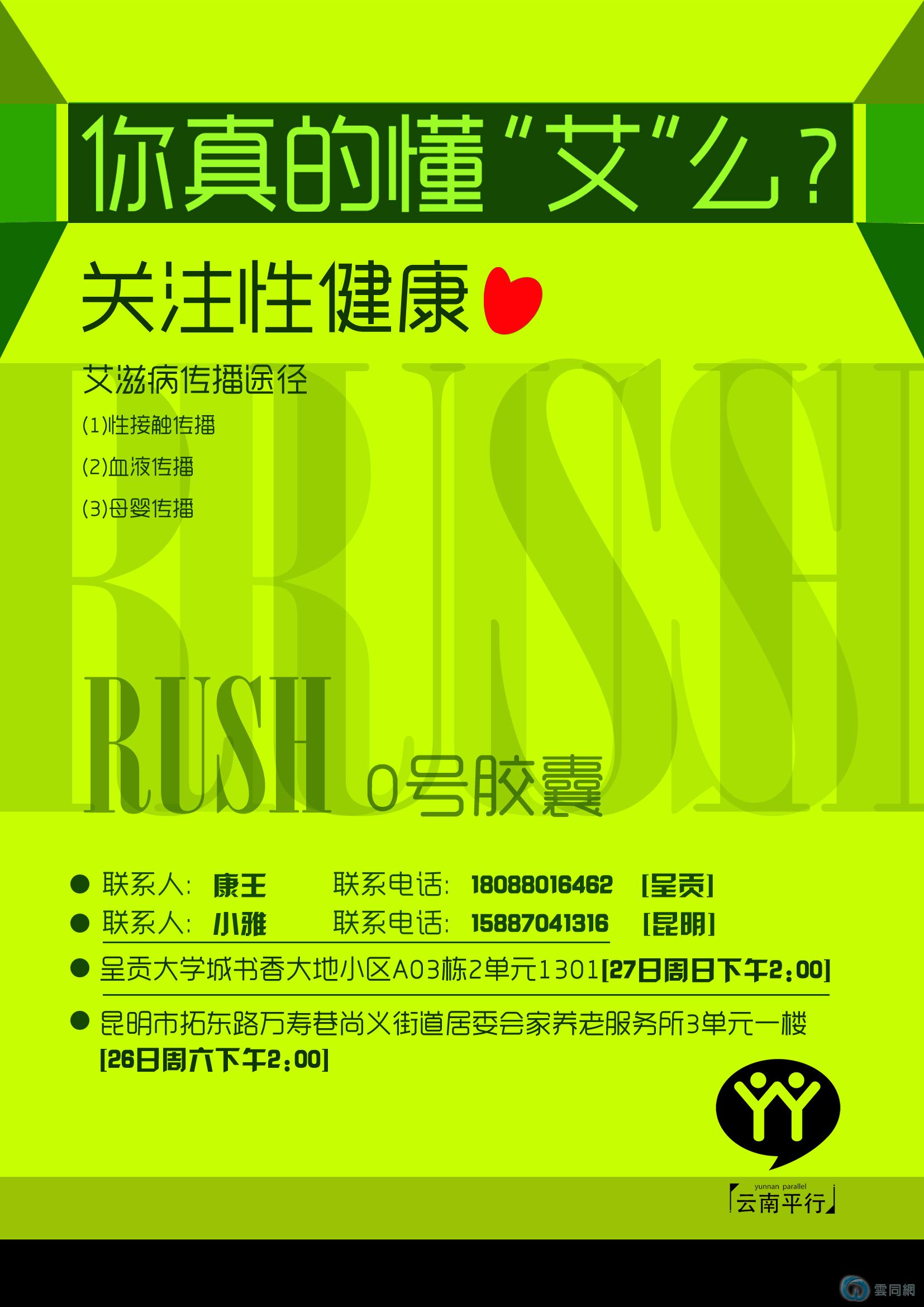 前段时间的商务部制订的《沐浴业管理办法(征求意见稿)》中关于“公共浴室要设置禁止艾滋病人入浴的标志”的条款大家一定都还有印象,这样不合理的条款竟然还有7成网友的支持,说明了很多人对艾滋病的不了解。所以,云南平行将在2013年10月26日/27日,为大家深入讲解艾滋病以及可能很多人用过的‘RUSH’和‘零号胶囊’。