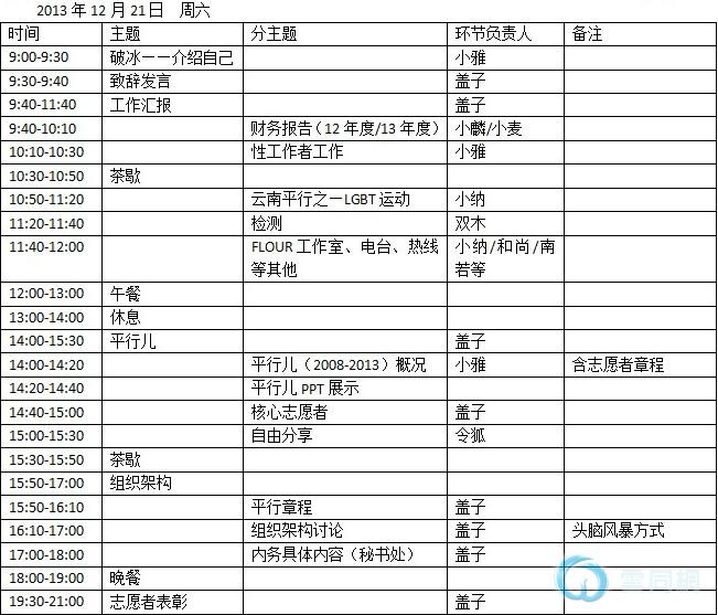 我们将于2013年12月21日、22日(周六、周日)举办本机构2013年年会。非常希望能看到您的参加。云南平行是一个纯草根的NGO小组,我们目前服务于LGBT群体与性工作者群体,主要针对公共卫生、社群文化、反歧视等方面进行工作。在2013年的工作中,我们成长了很多,也思考了很多。共志同者行这五个字实在是沉甸甸的。所以亲爱的平行儿们,大家一起,看看我们的足迹与未来!