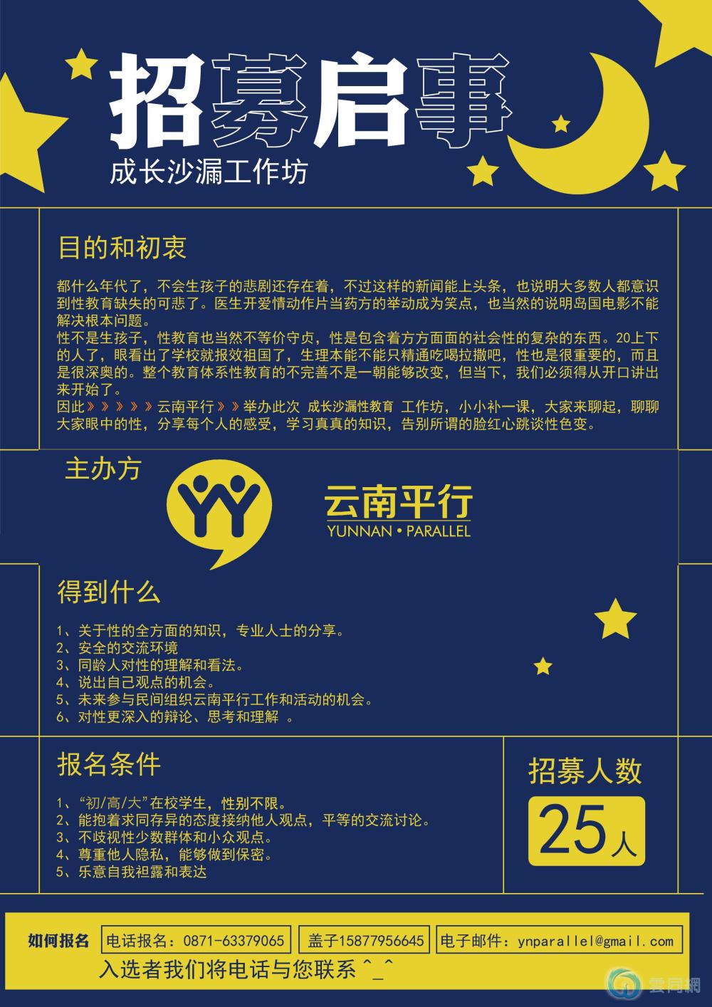 因此云南大学和云南平行合作举办此次《XXXX性教育》工作坊,小小补一课,大家来聊起,聊聊大家眼中的性,分享每个人的感受,学习真真的知识,告别所谓的脸红心跳谈性色变。