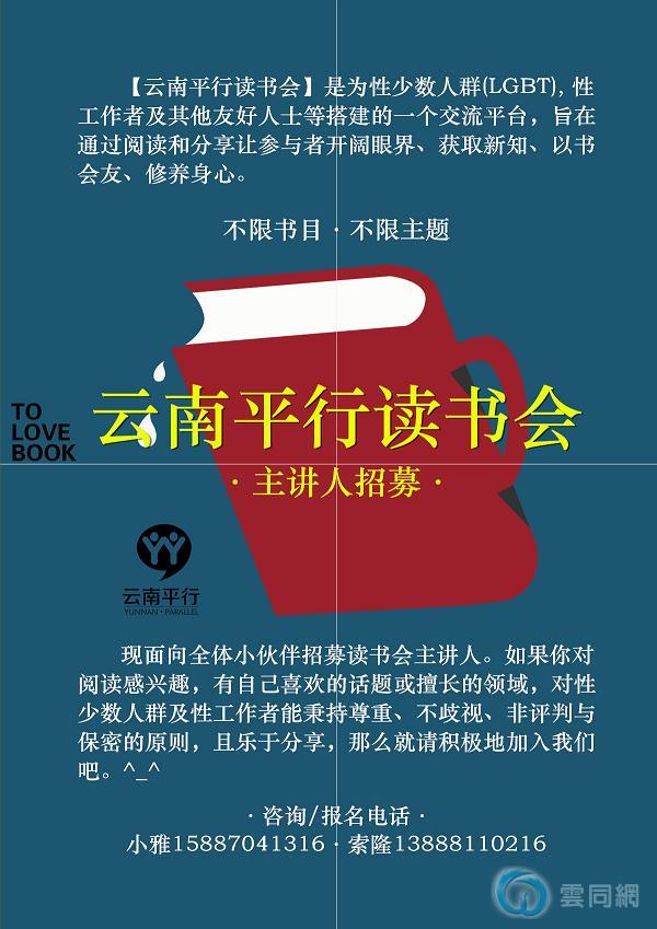 云南平行读书会现面向全体小伙伴招募读书会主讲人。如果你对阅读感兴趣,有自己喜欢的话题或擅长的领域,对性少数人群及性工作者能秉持尊重、不歧视、非评判与保密的原则,且乐于分享,那么就请积极地加入我们吧。^_^