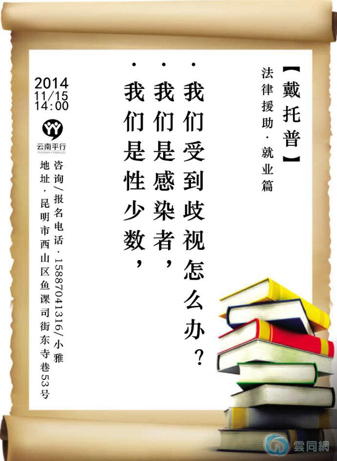 【写在前面】如果你在工作中因为性倾向,或是因为感染了HIV而受到歧视排挤应该怎么办?在就业过程中,身为性少数或感染者的我们,有哪些可以注意的事项,又有哪些可以保护我们法律法规?11月15号(周六)下午2点,我们将邀请专业的律师为大家解答这些我们遇到或可能遇到的问题,欢迎大家带着疑问来参加。^_^