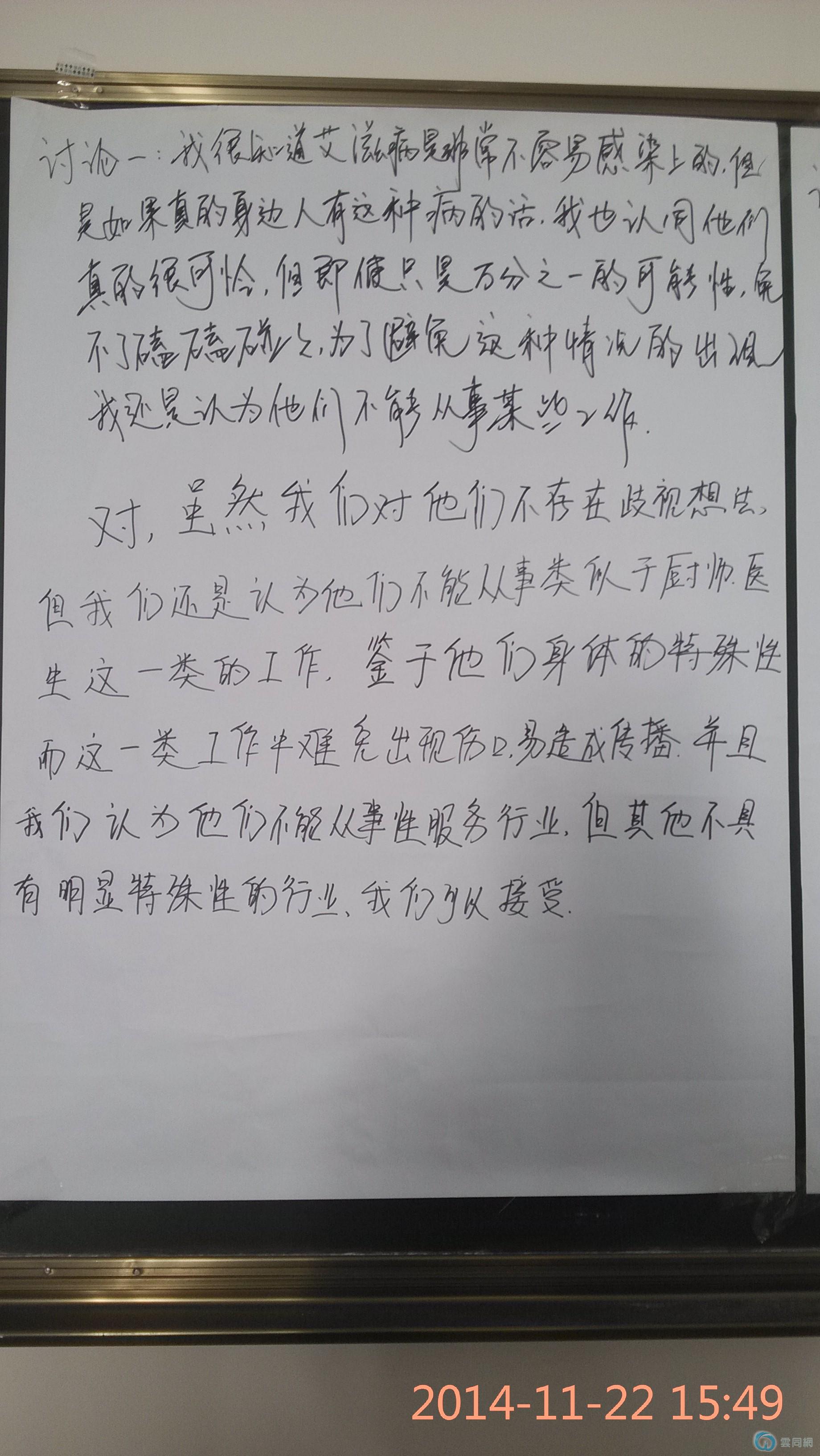 期间,志愿者们向参与者播放了《歧视艾滋病感染者的痛楚》《歧视是一堵墙》视频。志愿者们对视频本身没有进行深入的探讨,由在场的人自己思考,同时引申一个思考。视频中当那个艾滋病孩子的事情被曝光之后有很多爱心人士伸出援助的手给予自己的关心和帮助。但是当小孩要去上学时,却有家长联名写信拒止。是什么导致了这样的一个现象!这一问题,不单单是在场人员思考的问题,也是我们社会所有人员值得深思的问题!