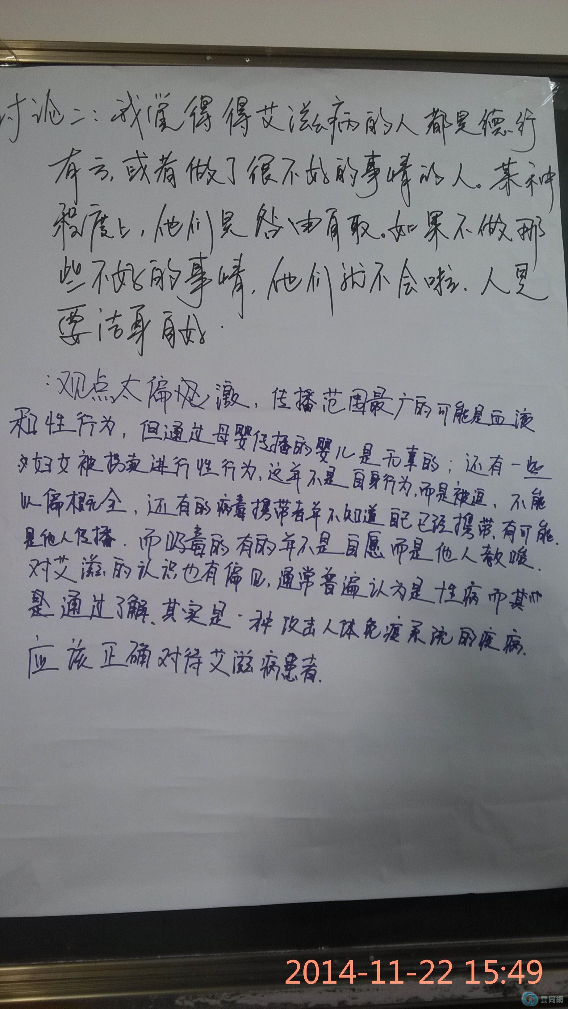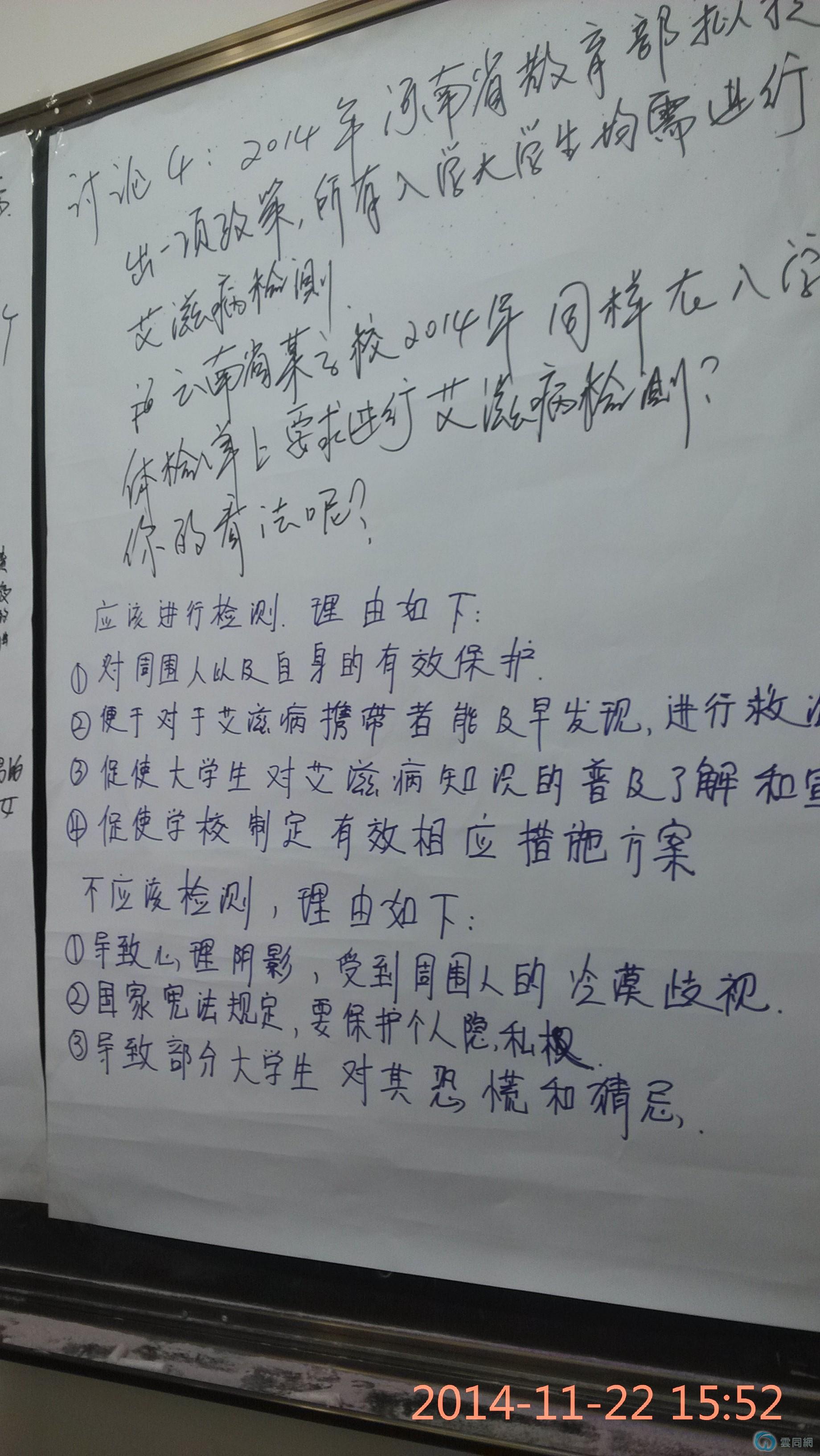 11月22号,这些志愿者们在云南师范大学文理学院举行了识艾防艾以爱迎艾活动。经文理学院青协的志愿者热情邀约就餐后,紧接着在教室平行志愿者为参与者对“艾滋”这个陌生而又令人发指的怪物进行宣讲。伴随着“美国群星演绎艾滋病宣传歌曲”视频,大家进行了破冰游戏,玩的是大风吹的游戏。几轮游戏结束后,即使大家彼此还相对陌生,但很快融入这个话题当中。随后,志愿者们便开始以视频内容讨论艾滋病这一主题,大家各抒己见,渐渐的了解艾滋病。之后便抛出一个问题,让在座的大家说说性传播疾病有些什么,尽管意见不太统一,但大家基本都回答了梅毒和淋病。志愿者们便阐述了国内常见的性病有:梅毒,淋病,尖锐湿疣,生殖器疱疹,当然,也包括艾滋病。