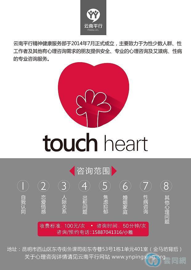 云南平行精神健康服务部于2014年7月正式成立,主要致力于为性少数人群、性工作者及其他有心理咨询需求的朋友提供安全、专业的心理咨询及艾滋病、性病的专业咨询服务。