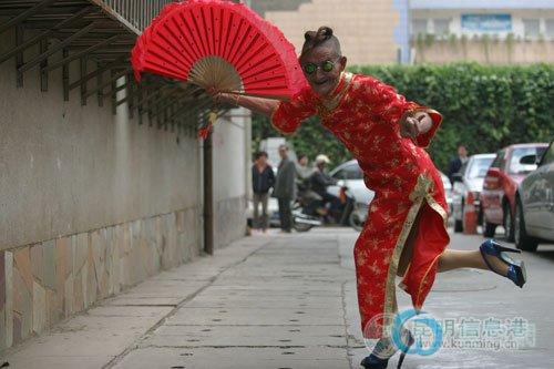 昨天下午,他装扮了一套更为雷人的造型。戴着墨镜、身穿红色旗袍、脚穿黄色长筒袜和蓝色高跟鞋,“噔噔”地在盘龙江畔惊艳登场了!如同见到“明星”一样,所有人都被镇住了。
