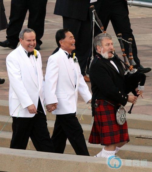 上周日,曾演过《星际迷航》、《英雄》等剧集的日本裔美国演员乔治-武井(George Takei)与多年的同性伴侣布拉德-奥特曼(Brad Altman)在洛杉矶市中心的日美国家博物馆举行了婚礼,一共有将近200名亲友到场庆祝。