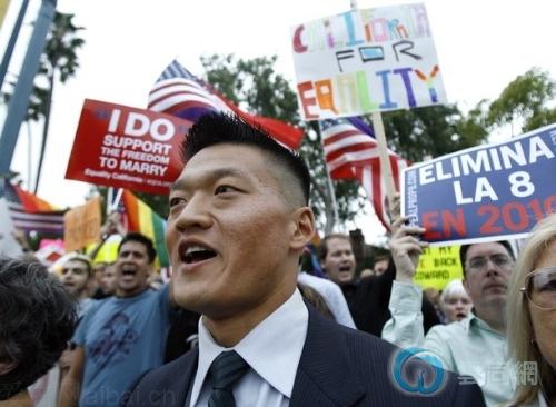5月27日在总统奥巴马正参加活动的加州Beverly Hilton酒店外,同性恋者和支持者们集会示威。军人催-丹(Dan Choi)。