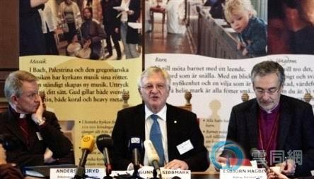 10月22日在瑞典的Uppsala,瑞典教会就同性婚礼议题投票结束后,(左起)路德教会大主教Anders Wejryd、教会大会主席Gunnar Sibbmark和教区主教Esbjorn Hagberg在记者会上。