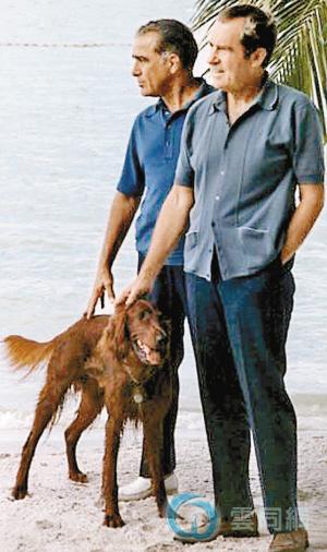 尼克松和雷博佐在比斯坎湾度假时的照片。