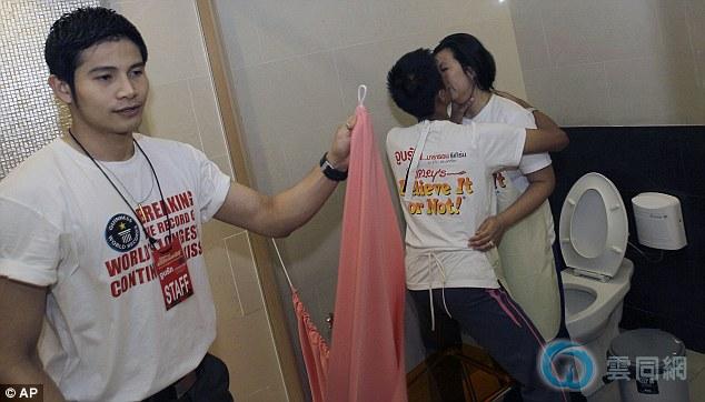 参加比赛的情侣在裁判员的监督下进入卫生间