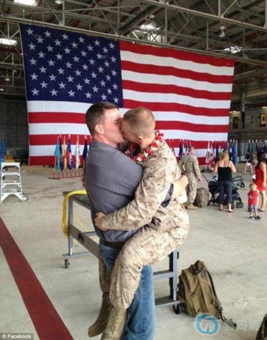 据英国《每日邮报》2月28日报道,美国驻阿富汗士兵Brandon Morgan近日在回国后首次见到网恋4年的同性恋人Dalan Wells,就扑到对方身上,与其激吻。相关照片已经发到社交网站上,引发热议,支持者纷纷表示对他们祝贺,反对同性恋的人则嗤之以鼻。
