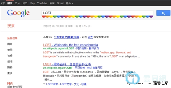 本月,在Google搜索LGBT、Gay等关键词,你会看到搜索框下方的彩虹条。