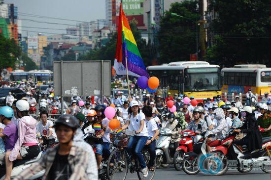 据法新社8月5日消息,越南首都河内8月5日举行了该国首次“同性恋骄傲”的游行活动,数十个装饰了气球和彩虹旗帜的人骑车在河内的街道上穿行而过。