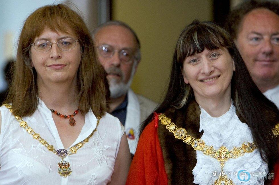 当地时间2007年5月24日,英国剑桥,首位变性市长詹妮·贝利(右)与同是变性人的市长夫人利德尔。两人对政治都很感兴趣,并先后当选为剑桥市议员。但为了照顾好家庭,利德尔没有参加今年的市议员竞选,转而当起了“贤内助”。在她的支持下,贝利成功当选剑桥市第801任市长。