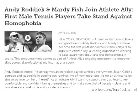 在昨天在推特上为科林斯写下支持二字后,罗迪克和费什又加入了反对歧视同性恋的联盟组织Athlete Ally,他们也成为首位加入该组织的男子网球运动员。纳芙拉蒂诺娃说他们将在网球界为同性恋者争取平等权利。