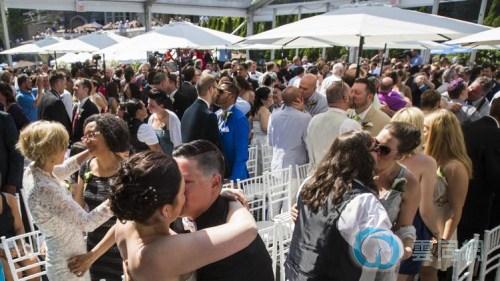 6月27日电 综合外媒报道,26日,超过100对来自世界各地的同性恋情侣,在加拿大多伦多参加名为“爱的庆典”的集体结婚典礼。报道称,这是北美规模最大的一次同性集体结婚典礼。