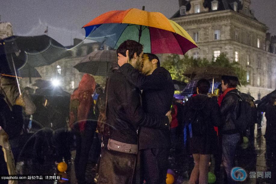 法国巴黎上百对同性恋者雨中亲吻