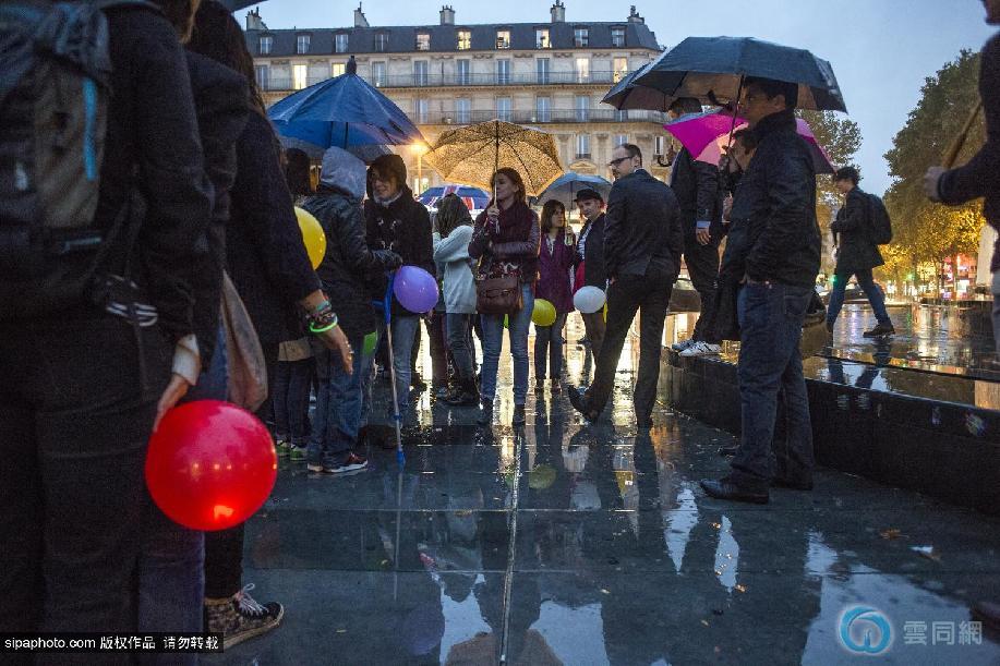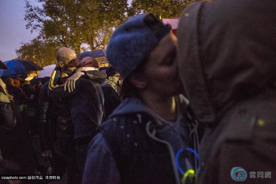 当地时间2014年10月6日,法国巴黎,正在当地进行的反对同性结婚合法化大示威游戏活动,在一天后迎来了“场面升级”,上百对同性恋示威者们在傍晚冒着小雨聚集在广场上,在同一时间开始亲吻彼此,以这样温馨浪漫的动作进行“无声的示威”。