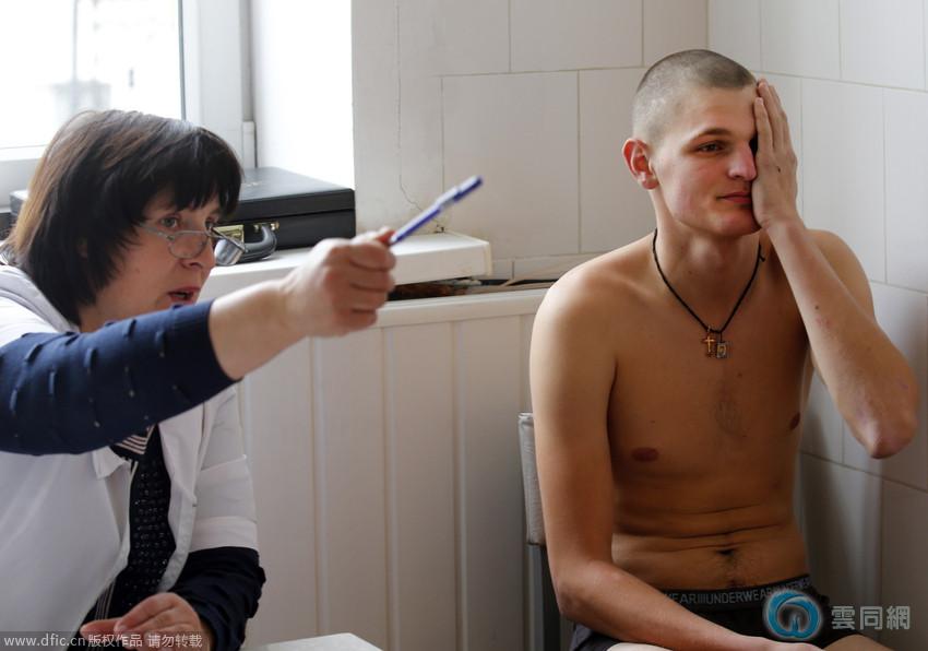 当地时间2014年10月20日,俄罗斯巴泰斯克,俄罗斯秋季征兵工作启动,在征兵站中脱衣接受健康检查,并准备领取军装。