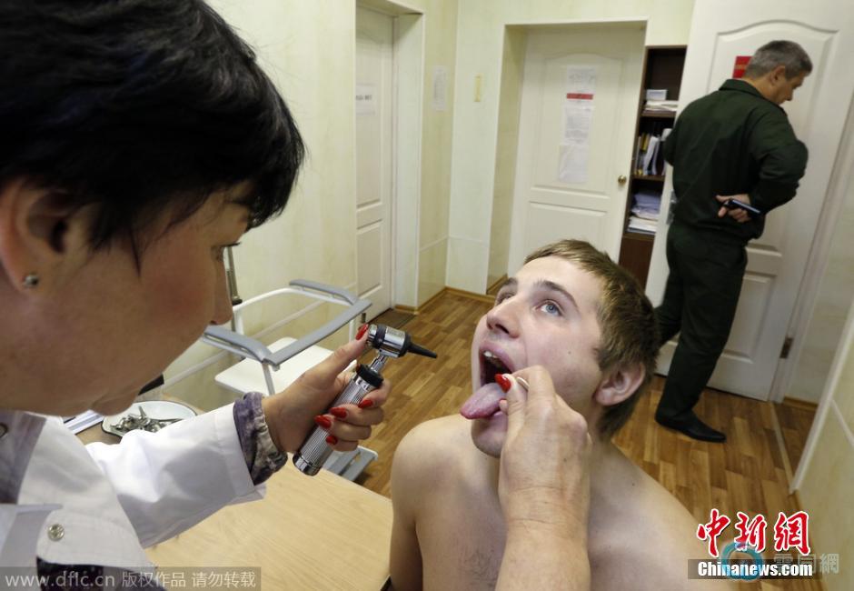 当地时间2014年10月20日,俄罗斯巴泰斯克,俄罗斯秋季征兵工作启动,在征兵站中脱衣接受健康检查,并准备领取军装。