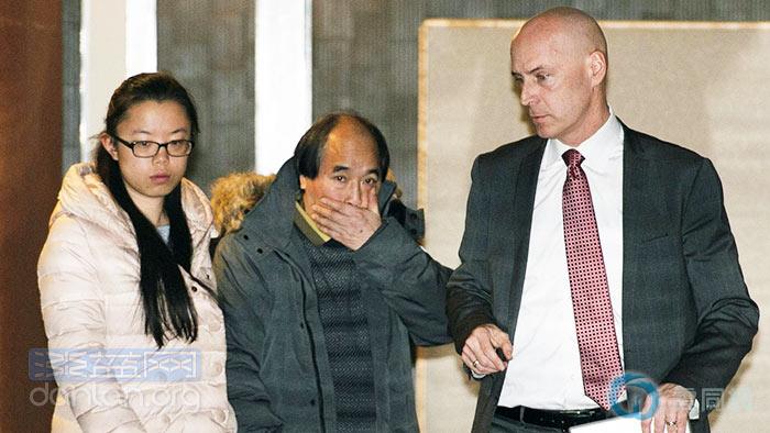 12月23日,林俊的父亲(中)在翻译员和律师的陪同下离开法院