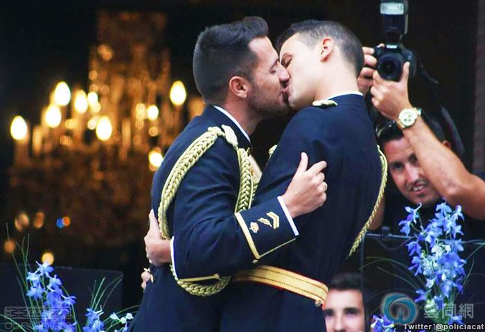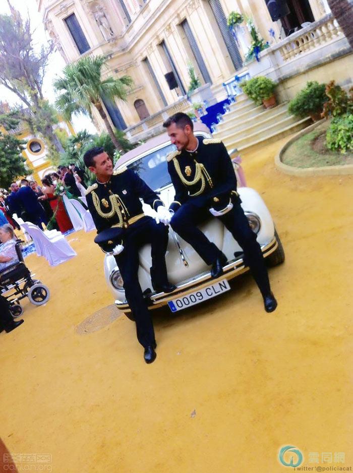 西班牙一对同性恋警察近日举行盛大婚礼,当地警务部门在推特上分享婚礼照片后,世界各地的推友纷纷留言祝福。