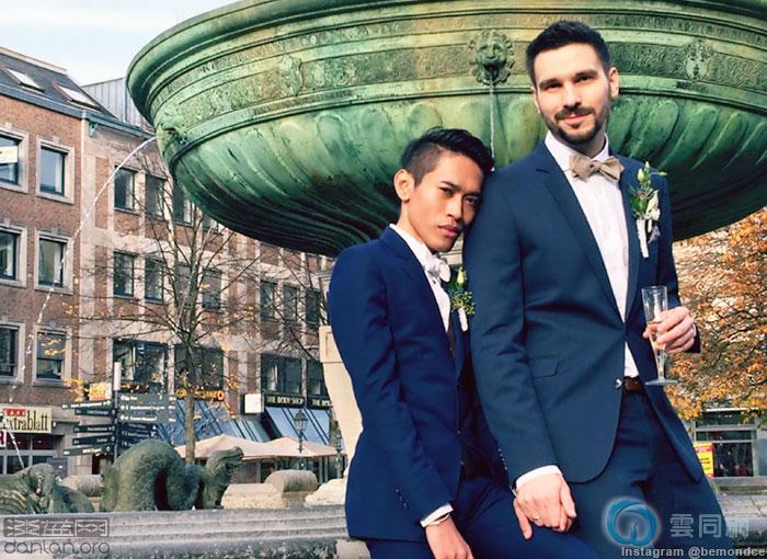 这是一组在网络上流行甚广的照片,拍摄于曼谷的地铁车厢里。照片中的黄发男子名叫坎迪(Naparuj Mond Kaendi),是一位泰国导演和模特公司创意总监。他身边的男子名叫米德(Thorsten Mid),来自德国,是模特。从他们手牵手的姿态不难判断,这是一对幸福的同性恋人。