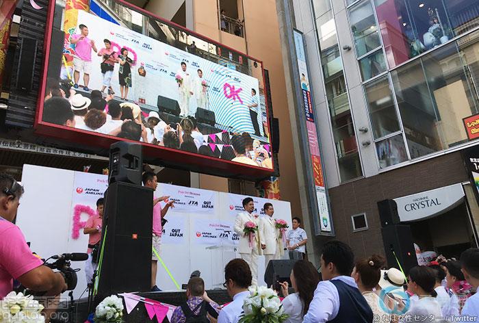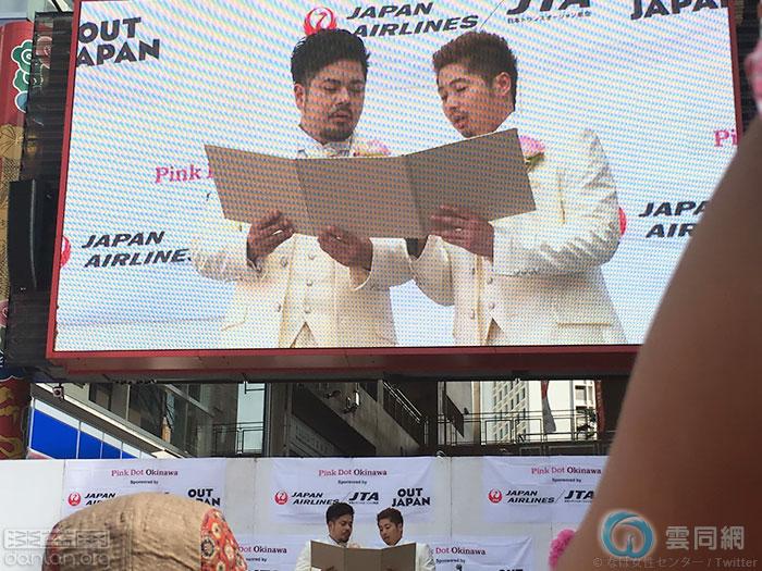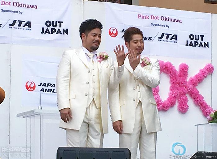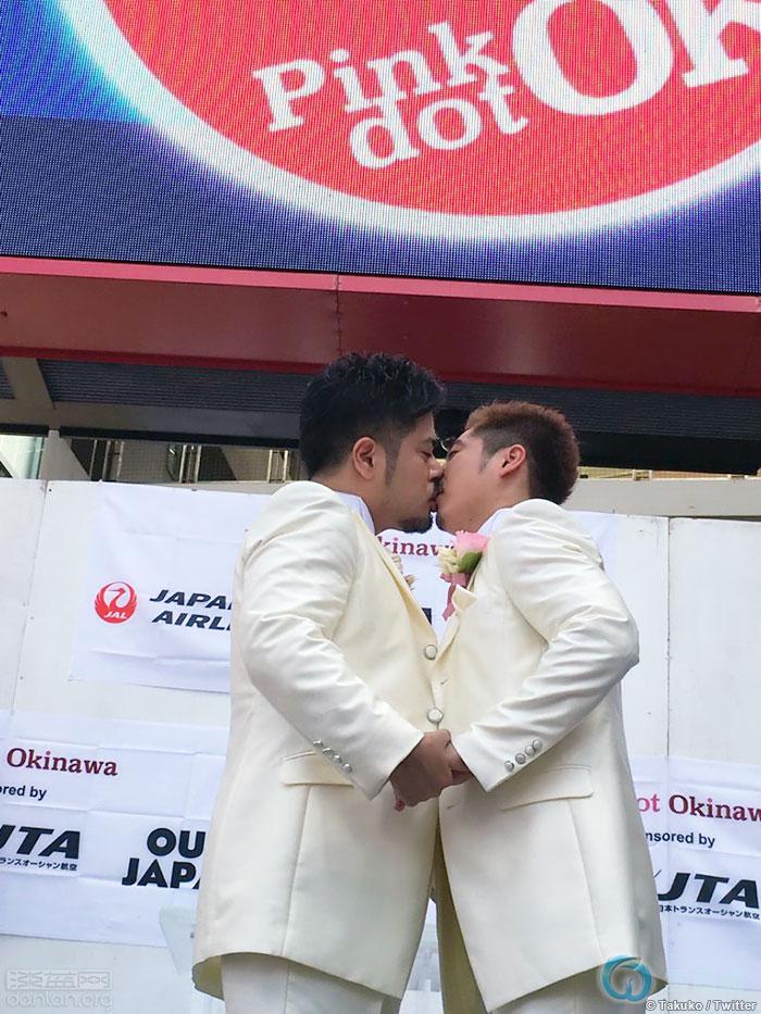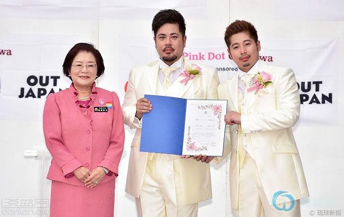日本那霸市从7月17日起签发同性伴侣关系证书,当天就有一对男同性恋人在市长和众多市民的见证下举行婚礼,他们的歌手好友中岛美嘉及其排球运动员丈夫清水邦广也到场恭贺。