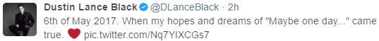 戴利在推特上写道:“2017年5月6日,我和一生挚爱结婚了!”他透露,大约120位最亲密的家人和朋友出席了婚礼。布莱克也在推特上说,他心中“也许有一天”会实现的希望与梦想,终于成真了。